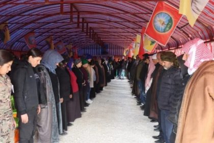 Gelê kantona Tebqayê, koçberên kantona Efrîn û Şehbayê sersaxî da malbatê endamê Hêzên Ewlekariya Hundirîn şehîd Şervan Rojvan û soza şopandina rêça şehîdan da.