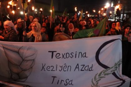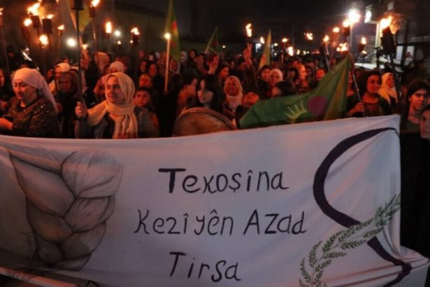Jinên ji bajarê Qamişloyê di çarçoveya çalakiyên 8ˊê Adarê de meşek meşaleyî li dar xistin û li dijî êrîşên li ser destkeftiyên jinan banga piştevaniyê kirin.
