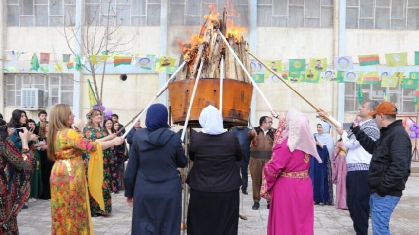 Endamên Tevgera Civaka Demokratîk (TEV-DEM) jî li pêşiya avahiya xwe ya li bajarê Qamişloyê agirê Newrozê pêxistin û li dora agir govend gerandin.
