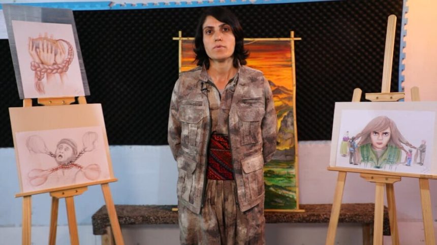 Tabloyek hêrsa jinan nîşan dide. Di tabloyê de çar kezî qirika kujerekî endamê DAÎŞ’ê yê dijminê Kurdan diguwişe.