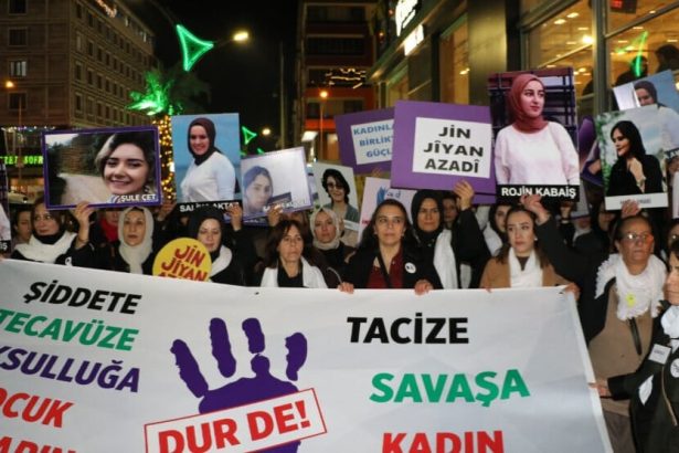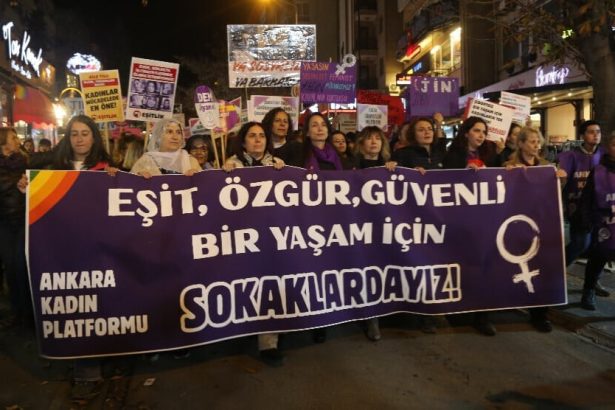 Jinên ku bi wesîleya 25’ê Mijdarê li Enqereyê daketin qadan wiha gotin, “Em ê ji bo hemû bindestan, li dijî pergala serdestiya zilam xwedî li aştiyê derbikevin.”
