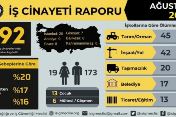 Meclîsa Tenduristiya Karkeran û Ewlehiya Kar (ÎSÎG) rapora cînayetên kar a meha Tebaxê ya li Tirkiyeyê eşkere kir.