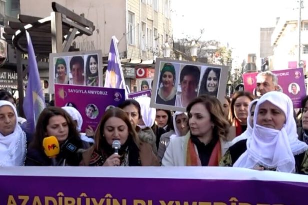 Endama Meclisa Partiyê (PM) ya Partiya Herêmên Demokratîk (DBP) Sêvê Demîr, endama Kongreya Jinên Azad (KJA) Fatma Uyar û Hevseroka Meclisa Gel a Silopiyayê Pakîze Nayir di salvegera 10’an a…