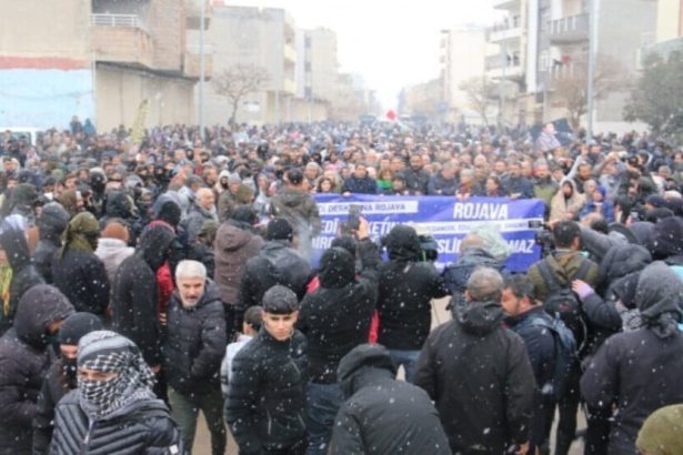 Li navçeya Pirsûs a Rihayê, bi hezaran kes li hev kom bûn û ber bi sînorê Kobanê ve dest bi meşê kir ku dorpêçkirî ye.