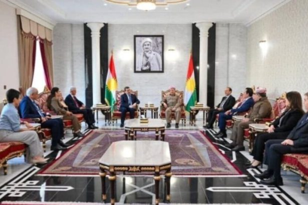 Fermandarê Giştî yê Hêzên Sûriyeya Demokratîk (QSD) Mazlûm Ebdî û Hevseroka Daîreya Têkiliyên Derve ya Rêveberiya Xweser a Bakur û Rojhilatê Sûriyeyê Îlham Ehmed, li Dihokê bi Mesûd Barzanî re…