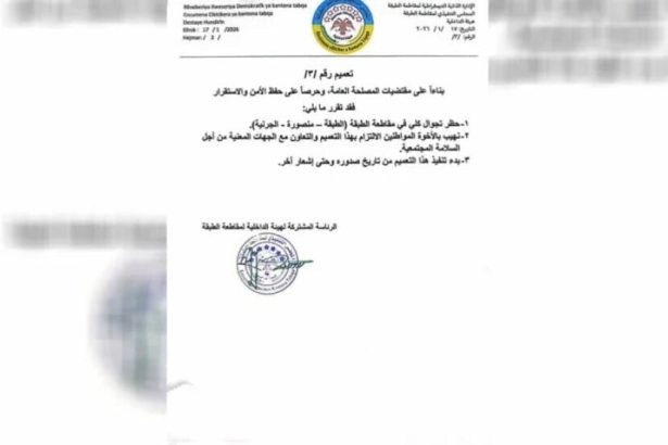 Desteya Hundirîn a Kantona Tebqayê ji bo Tebqa, Mensûra û Cirniye qedexeya derketina derve ragihand.
