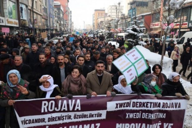 Li navçeya Qoser a Mêrdînê bi hezaran kes li dijî êrîşên çeteyên HTŞ, DAÎŞ û dewleta Tirk ên li ser Rojava, meşiyan.