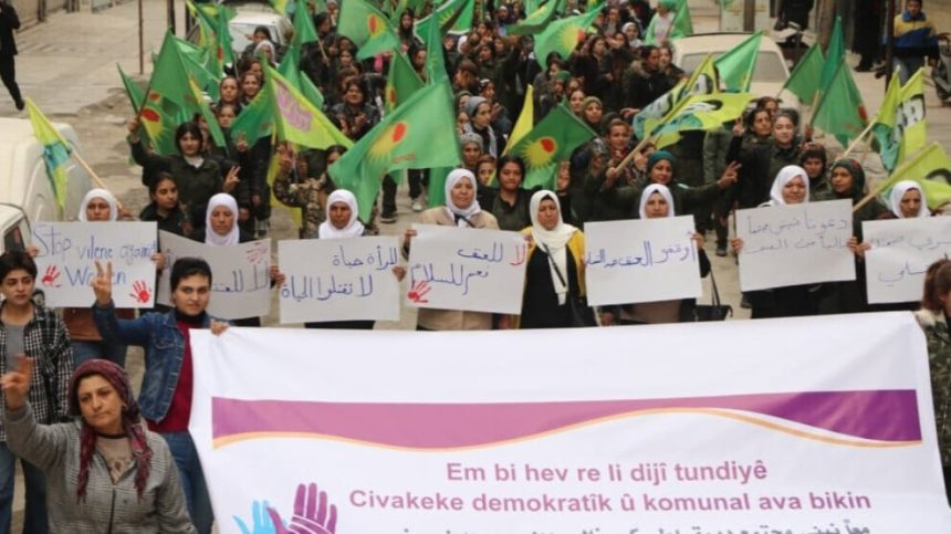 Li bajarê Hesekê jî bi pêşengiya Kongra Star meşeke girseyî bi dirûşma “Em bi hev re li dijî tundiyê civakeke demokratîk û komînal ava bikin” hat lidar xistin.