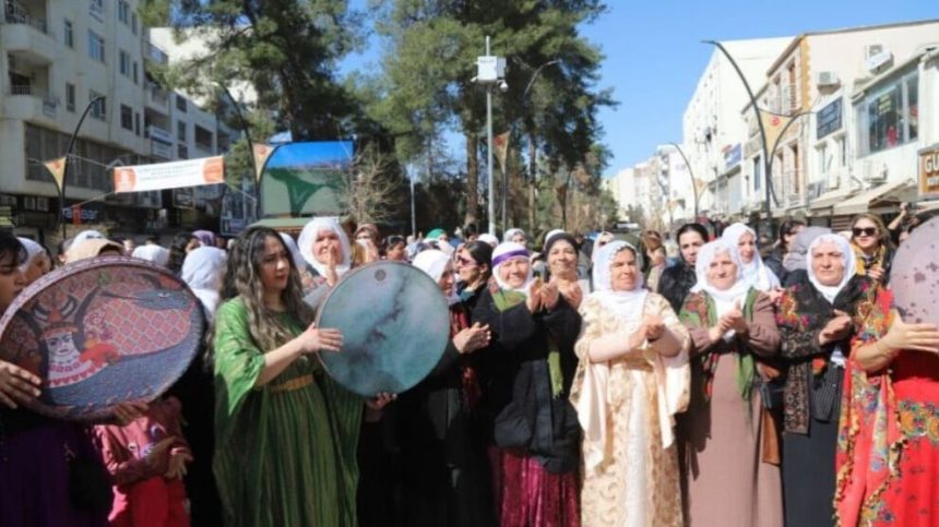 Jin bi kincên xwe yên gelêrî û neteweyî li Qada Azadiyê li hev kom bûn û li ber dirûşma “Jin, Jiyan, Azadî” govend gerand. Piştre jî bi pankart û dowîzan dest bi meşê kir û li Parka Jinê ya 8’ê Adarê daxuyaniyek da.