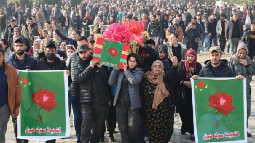 Cenazeyê şervana Yekîneya Parastina Jin (YPJ) Stêrk Hêzil (Munîra Elî) ku di 3`ê Kanûna 2025`an li Dêr Hafir şehîd bûbû, îro bi merasîmeke girseyî li Pakrewangeha Şehîd Dicle ya bajarê Kobanê hat veşartin. Şêniyên kantona Firatê, endamên saziyên Rêveberiya Xweser, partiyên siyasî û rêxistinên jinan beşdarî merasîmê bûn.