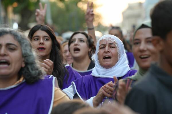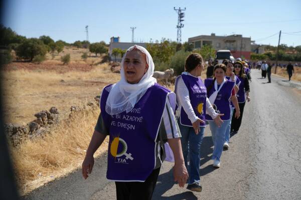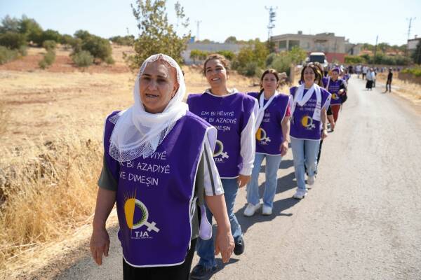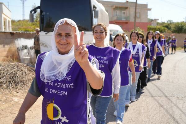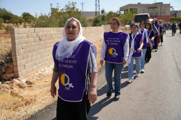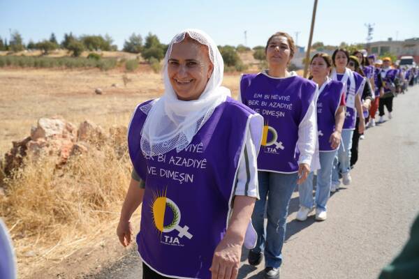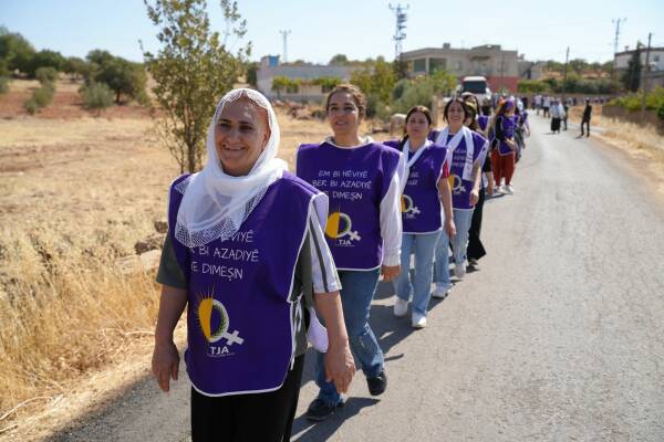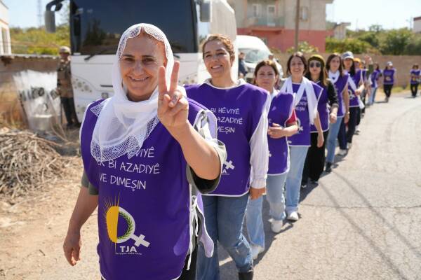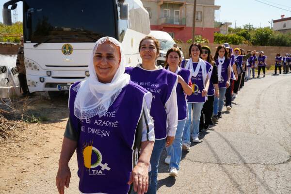 Jinên ku ji bo aştiya civakî û çareseriya demokratîk a pirsgirêka Kurd dimeşin, sedemê tevlîbûna xwe ya meşê wiha vedibêjin: “Êşên ku me kişandine, bila ti kesên din jiyan nekin.”