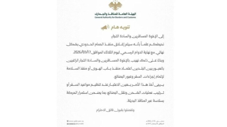 Desteya Giştî ya Deriyên Sînor û Gumrikê ya hikumeta demkî ya Sûriyeyê ragihand ku deriyê sînor ê Hemamê yê di navbera Sûriye û Tirkiyeyê de, ku li gundewarên Helebê ye, ji sibê pê ve bi temamî wê bê girtin.