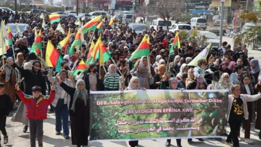 Îro bi sedan şêniyên bajarê Kobanê û koçberên Efrînê yên ku li Kobanê dijîn, di salvegera 8’emîn a dagirkirina Efrînê de daketin qadan. Girseya gel ji Qada Jina Azad li hev kom bû û heta bi Qada Aştiyê meşiya. Di meşê de şaxên darên zeytûnê û wêneyên Rêber Apo û alên kesk, sor û zer hatin hildan û dirûşma “Bijî berxwedana Efrînê” hat berzkirin.