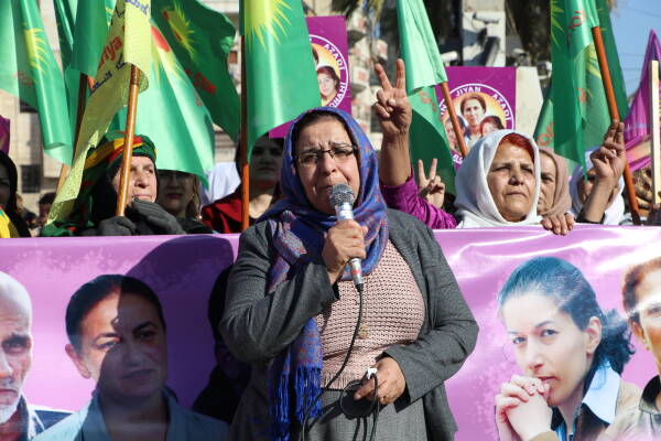 Di meşê de dirûşmên mîna “Jin Jiyan Azadî”, “Bimire faşîzm”, “Bimre Îxanet” û “Na Ji Îxanetê Re” hatin berzkirin. Her wiha di meşê de alên Kongra Star her wiha wêneyên Şehîd Sakîna Cansizê, Leyla Şaylemaz û Fîdan Dogan hatibûn hiladan.