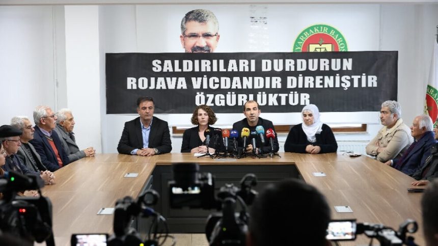 Platforma Saziyên Demokratîk, Înîsiyatîfa Yekîtiya Demokratîk û partiyên Kurdî têkildarî êrişên li ser Bakur û Rojhilatê Sûriyeyê li Baroya Amedê daxuyaniyek dan. Li gel Hevserokên Giştî yên Partiya Herêman a Demokratîk (DBP) Çîgdem Kiliçgun Ûçar, Keskîn Bayindir, nûnerên gelek partiyên siyasî û rêxistinên civakî yên sivîl beşdarî daxuyaniyê bûn. Li salona daxuyaniyê pankarta bi nivîsa “Êrişan bisekinînin. Rojava wijdan e, berxwedan e, azadî ye” hate daliqandin.