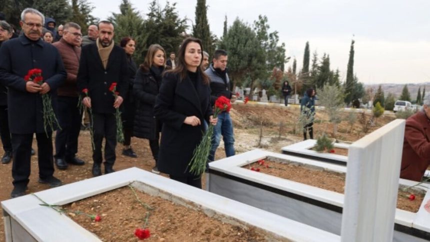 Hevseroka Giştî ya DBP’ê Çîgdem Kiliçgun Ûçar û Hevseroka Giştî ya DEM Partiyê Tulay Hatîmogullari qurbaniyên erdheja 6’ê Sibata 2023’yan li Semsûrê li ser gora wan bi bîr anîn.