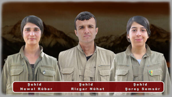 “7 û 8’ê Cotmeha 2019’an li Herêmên Parastinê yên Medyayê di êrîşên dijmin de ewladên leheng û milîtanên fedaî yên Apoyî hevrêyên me Şoreş, Rizgar û Newal heta nefesa xwe ya dawî li ber xwe dan û şehîd bûn.