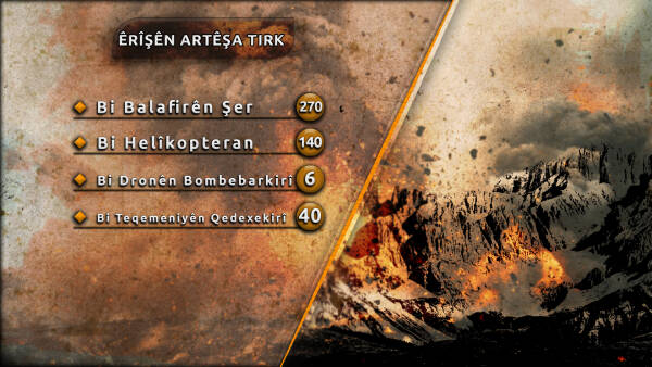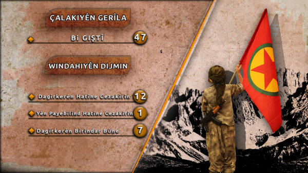 Dewleta Tirk a dagirker di nava meha Mijdarê de 6 caran bi droneyên bombebarkirî û 40 caran jî bi teqemeniyên qedexekirî êrîş bir ser tunelên me yên şer ên li Herêmên Parastinê yên Medyayê. Di heman demê de qadên berxwedanê 270 caran bi balafirên şer û 140 caran jî bi helîkopterên êrîşê bombe kir. Hêzên me bi wêrekî û performanseke mezin li hemberî van êrîşan li ber xwe dan, di nava şert û mercên zivistanê de 47 çalakiyên cuda yên gerîla lidar xistin. Di van çalakiyan de yek jê fermandarekî payebilind, 12 jê leşkerên ji bo pereyan şer dikin bi giştî 13 dagirker hatin cezakirin. Her wiha kepçeyek, wesayiteke zirxî, sîstemeke radarê, kamerayeke mobesse, drone û gelek malzemeyên dagirkeran hatin îmhakirin.
