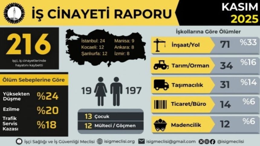 Meclisa Tenduristiya Karkeran û Ewlehiya Kar (ÎSÎG), rapora xwe ya “cînayetên kar” a meha Mijdarê aşkera kir. ÎSÎG’ê, da zanîn ku di meha Mijdarê de 216 karkeran di cînayetên kar de jiyana xwe ji dest dane. Bi domdarî hate gotin ku ji van karkeran 197 jê mêr, 19 jin û 13 jî zarok bûn. Hat gotin ku ji van karkeran 12 jê penaber bûn.