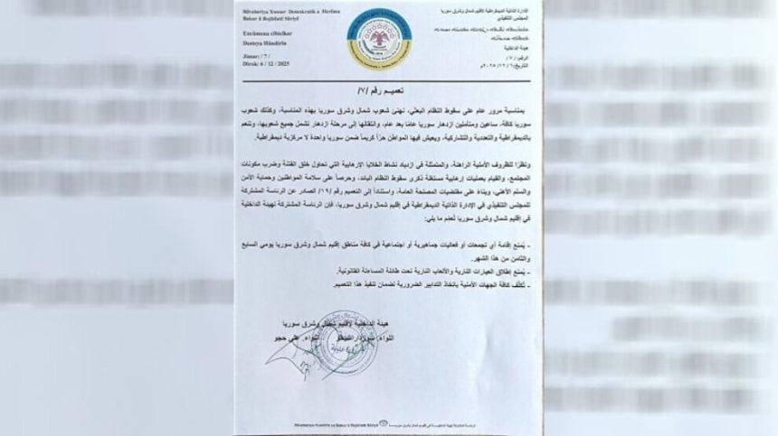 Li tevahî herêmên Bakur û Rojhilatê Sûriyeyê di rojên 7 û 8’ê vê mehê de kombûn û çalakiyên girseyî qedexe ne.