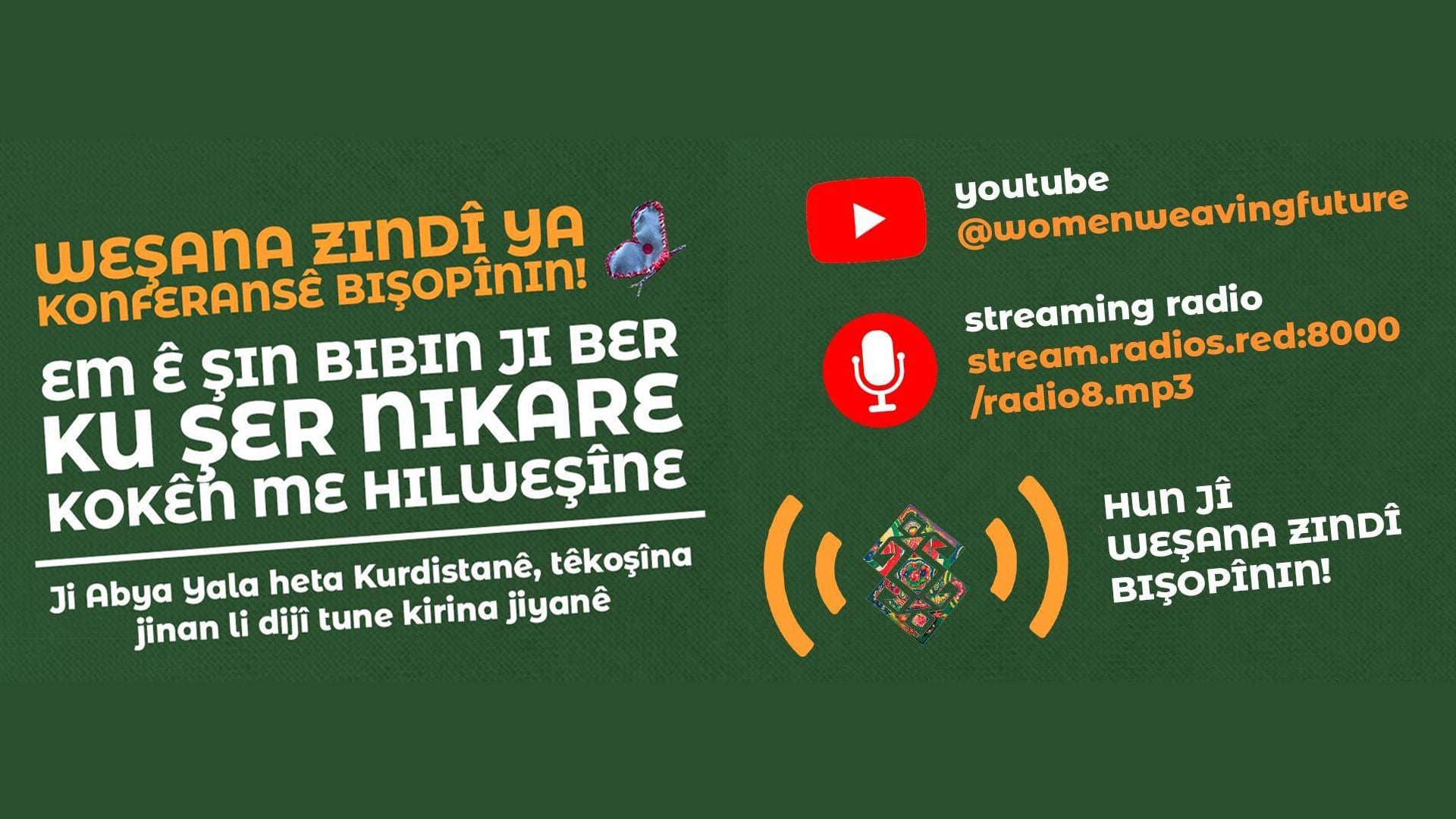 Hûn dikarin konferansê di kanala youtube ya @womenweavingfuture de zindî bişopînin an jî ji lînka stream.radios.red:8000/radio8.mp3 lê guhdarî bikin.