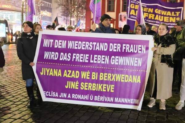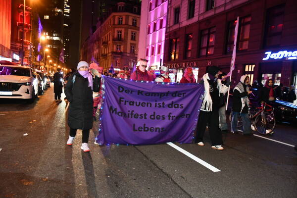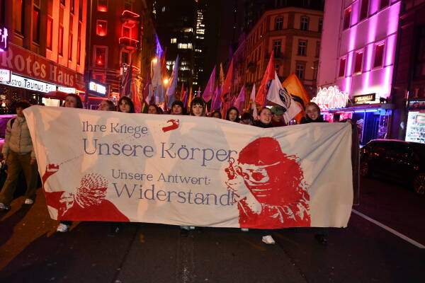 Jinan li Frankfurtê bi pêşengiya Yekîtiya Jinên Kurd a Elmanyayê (YJK-E) meşiyan. Meş li Brandt Platzê destpê kir û li Sud-Bahnhofê bi mitîngekî bi dawî bû. Jinan pankartên bi nivîsa, “Şerê we xwîna me ye” û “Em ê xwe bi felsefeya “Jin, Jiyan, Azadî” biparêzin” hilgirtin û bi pêxistina findan jinên di encama tundiya mêr-dewletê de hatine qetilkirin, bi bîr anîn.
