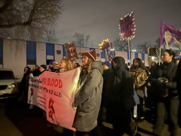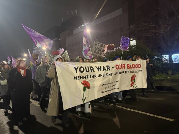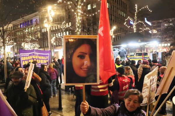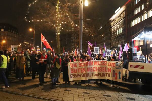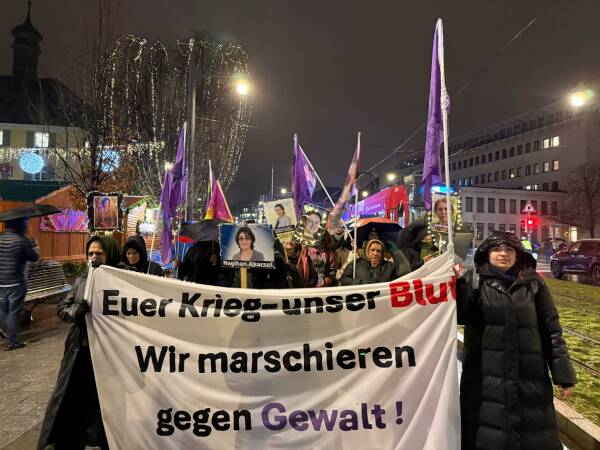 Li Hamburgê bi hezaran kes, di saet 18:00’an de, di meşa ku li rawestgeha Landwehrê destpê kir de, li hev civiyan. Platforma jinan a girseyî ku Meclîsa Jinan a Rojbîn jî di nav de bû, bi dirûşmeya “Em ji bo aştî û jiyana bêyî tundî dimeşin” meşiya. Di daxuyaniya li ser navê platformê de, hat destnîşankirin ku ew li dijî tundî, zext û qirkirinê dimeşin.