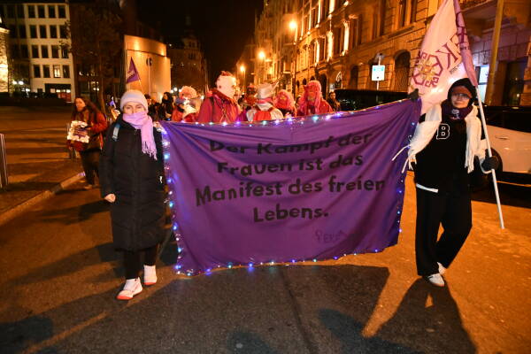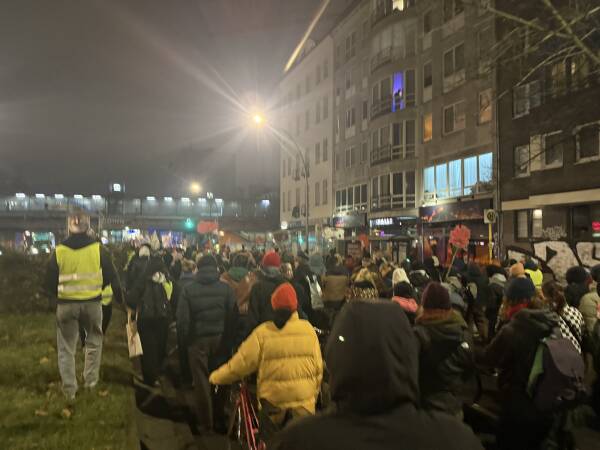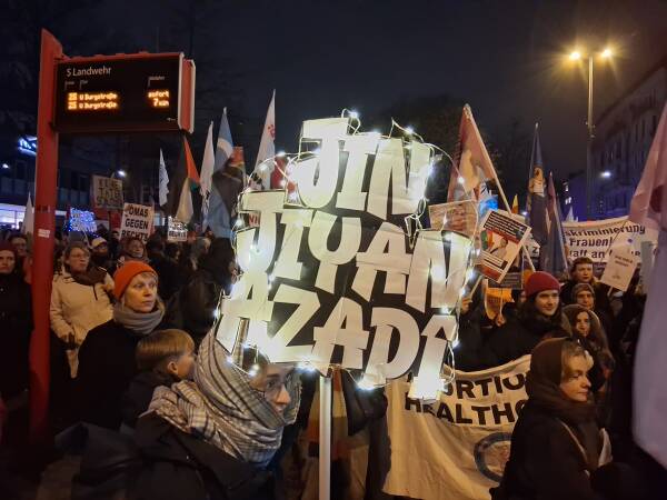 Meş heta rawestgeha Friedrichsbergê dewam kir û gelek caran dirûşmeyên, “Jin, Jiyan, Azadî”, “Jina têkoşer, jina jiyan dike ye” û “Pergala baviksalarî hilweşînin” hatin berzkirin.