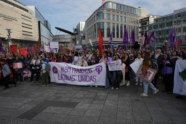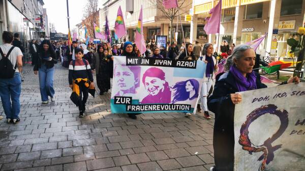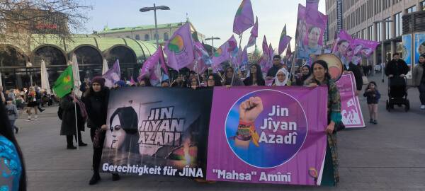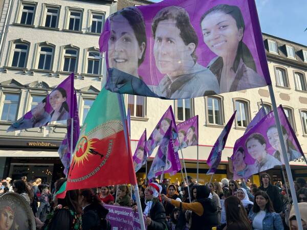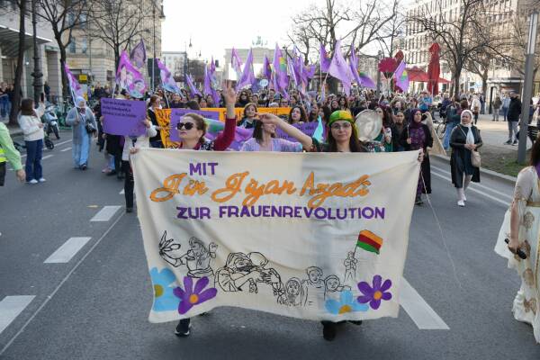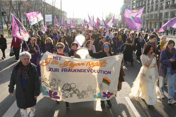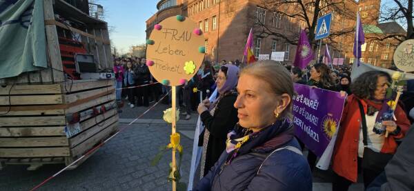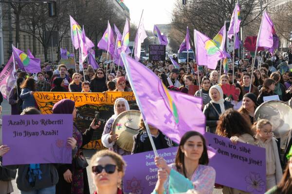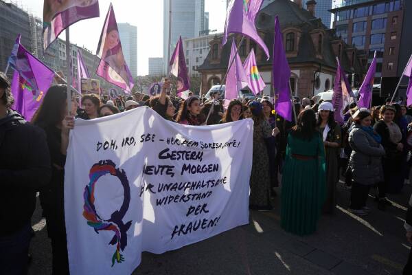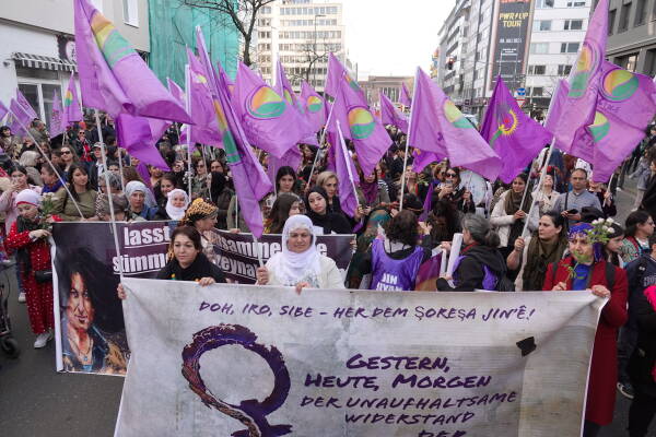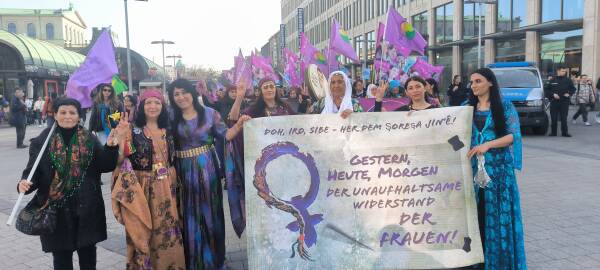 Li Elmanyayê bi hezaran jin bi boneya 8’ê Adarê Roja Jinên Kedkar ên Cîhanê daketin qadan. Jinên Kurd bi cil û bergên xwe yên neteweyî yên bi reng beşdarî pîrozbahiyan bûn û dirûşmeyên “Jin, Jiyan, Azadi” ve “Bijî Serok Apo” qiriyan. Beşdaran îşaret bi têkoşîna jinan kirin û ji bo wekhevî û azadîxwaziya jinê banga mezinkirina piştevaniyê kirin.