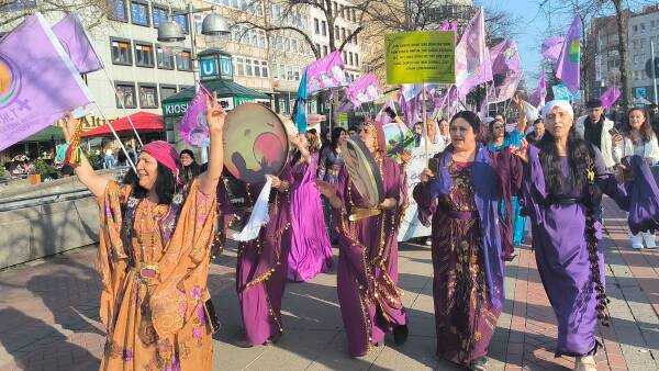 Bi hezaran jin di çarçoveya 8’ê Adarê Roja Jinên Kedkar ên Cîhanê de li ber stasyona trenê ya Dusseldorf ê Elmanyayê kom bûn. Jinên ku di destên wan alên binefşî û pankartên rêxistinên jinên Kurd hatin qadê, bi cil û bergên xwe yên Kurdî coşeke mezin afirandin. Li qadê bi erbane, zurne û defê govendên gerandin.