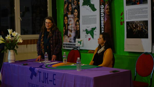 Axaftina vekirinê li ser navê Austellunggruppe Jin Jiyan Azadî, ji aliyê Newroz Sonmezer ve hat kirin. Newroz Sonmezer diyar kir ku pêşangeh bi armanca xuyakirina destkeftiyên dîrokî û siyasî yên şoreşa jinê hatiye amadekirin.