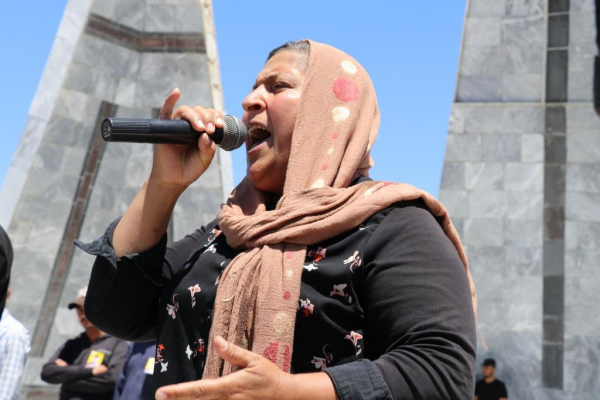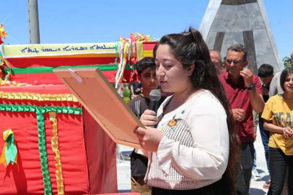 Piştî deqeyekê rêzgirtinê, Rêveberiya Komîna Şano ya Kobanê Leyla Ehmed axivî û diyar kir ku tenê dirûşmeya wan ‘tolhildan’ û ‘berxwedan jiyan e’ û got: “Ji Heqî heta Mazlûman tenê yek dirûşmeya me heye ew jî berxwedan jiyan e. Ne dagirkerî ne jî êrîş êdî nikarin me tune bikin, em ê bi ser bikevin.”