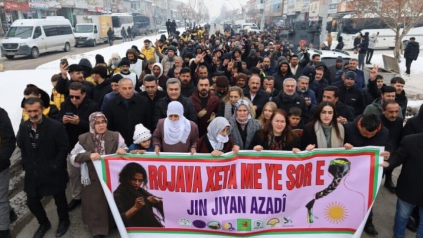 Bi sedan kes li ber avahiya navçeyê ya DEM Partiyê kom bûn û bi dirûşmeya “Bijî berxwedana Rojava” ber bi navenda navçeyê ve meşiyan.