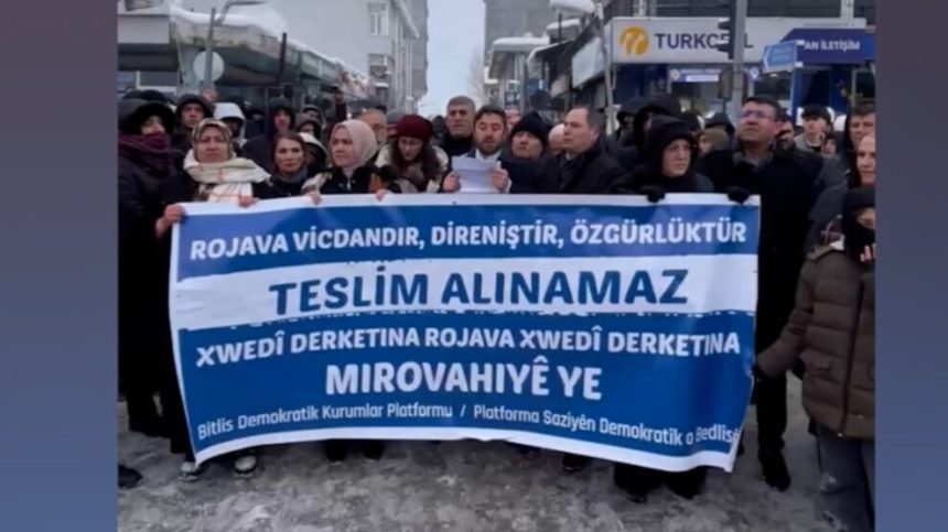 Tevî astengiyan jî, girseyê dorpêçê şikand û ber bi parka ku dö daxuyanî lê bıhata dayin ve meşiya. Gırse dirûşmeyên “Bijî berxwedana Rojava” meşıya. Piştî meşê, Hevserokê DEM Partiyê yê Norşînê Yusuf Bîngol axivî û got: “Em bi tu awayî êrişên li dijî Rojavayê qebûl nakin.” Bîngol anî ziman ku ev êriş beşek ji komployeke navneteweyî ne.