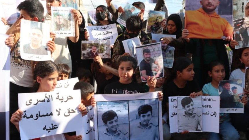 Malbatên dîlgirtiyan li pêş avahiya NYˊyê ya Qamişloyê daxwaza berdana dîlgirtiyan kirin.