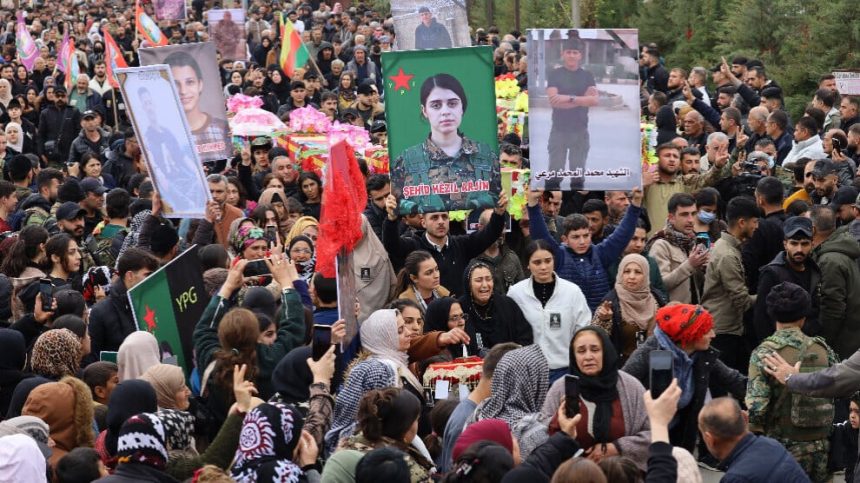 Bi beşdariya hezaran kesan cenazeyê 5 şervanên QSD û YPG’ê hatin veşartin û ji bo 8 şervanên merasîma giyabî hat lidarxistin