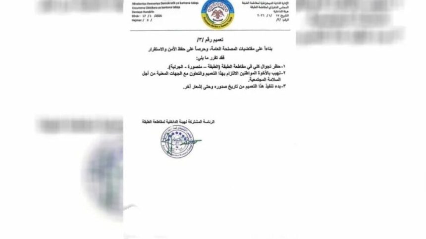 Desteya Hundirîn a Kantona Tebqayê bi biryarekê qedexeya giştî ya derketina derve li 3 bajaran (Tebqa, Mensûra, Cirniye) ragihand.