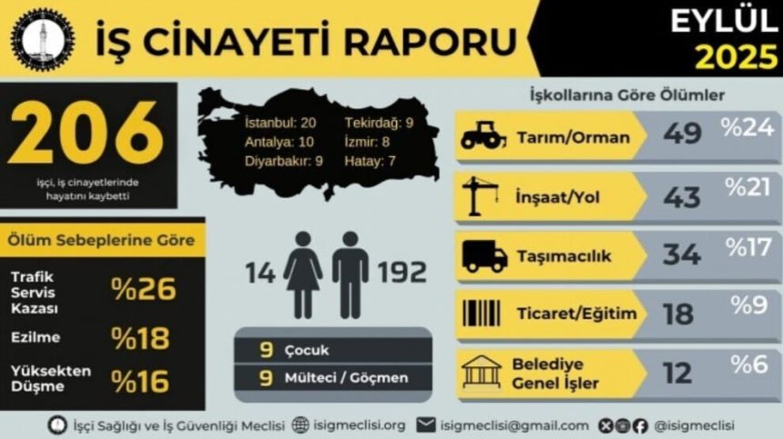 Meclîsa Ewlekariya Kar û Tenduristiya Karkeran (ÎSÎG) rapora xwe ya li ser kuştina karkeran a Îlona 2025'an a li Tirkiyeyê eşkere kir. Li gorî raporê tenê meha Îlonê 206 karker, 9 mehên dawî jî 1.566 karker mirin.