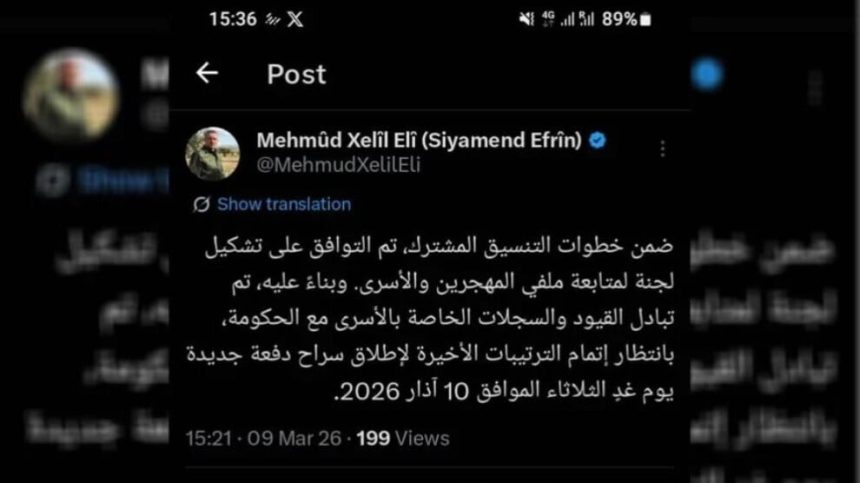 Xelîl li ser hesabê xwe yê Xˊê nivîsî ku “Di çarçoveya gavên koordînakirina hevbeş de li ser avakirina komîteya şopandina dosyayên koçber û dîlgirtiyan lihevkirin pêk hat. Li gorî wê, tomar û belgeyên taybet bi dîlgirtiyan bi hikumetê re hatin guherandin û li benda temamkirina tedbîrên dawîn in ku komeke din sibe (10 Adar 2026) were berdan.”