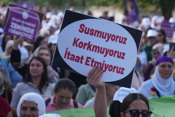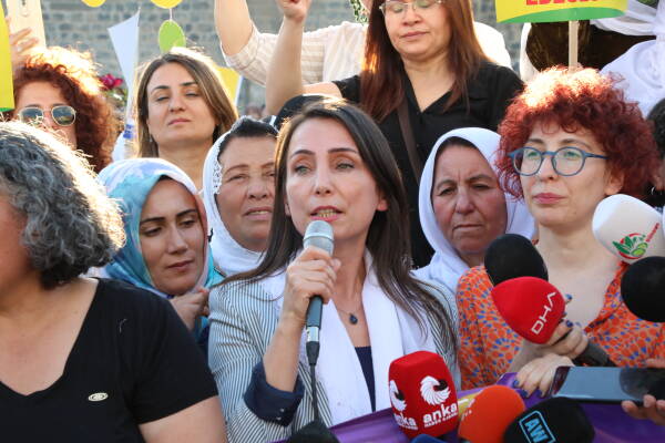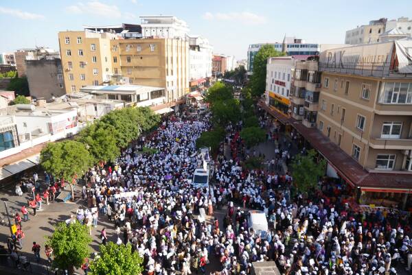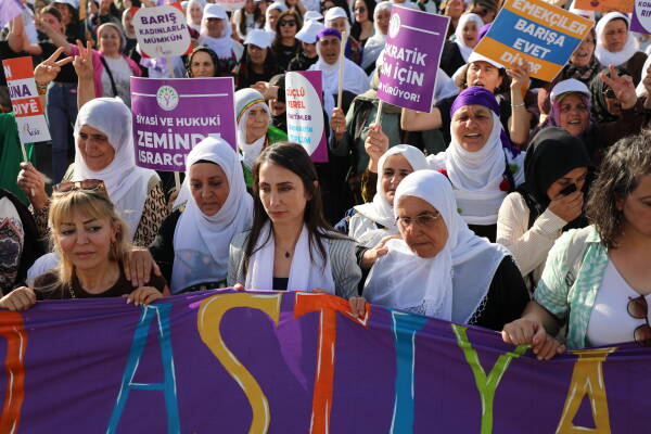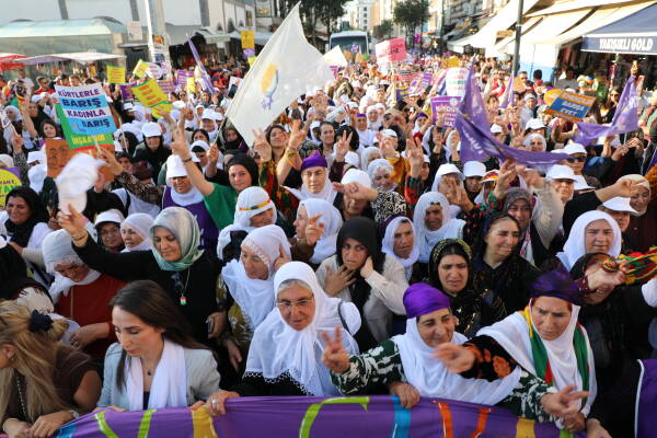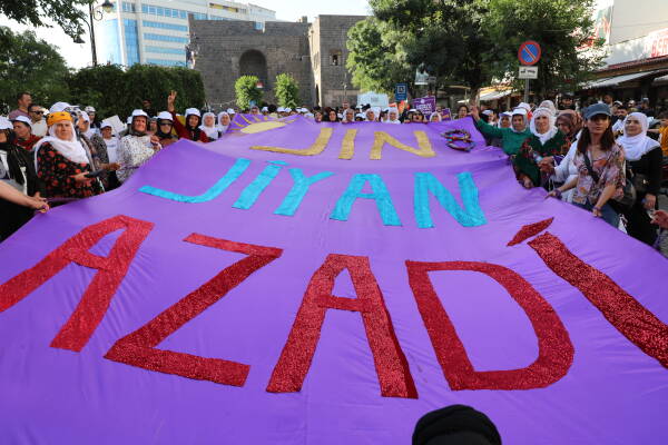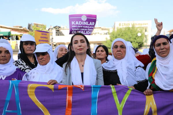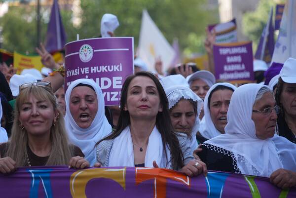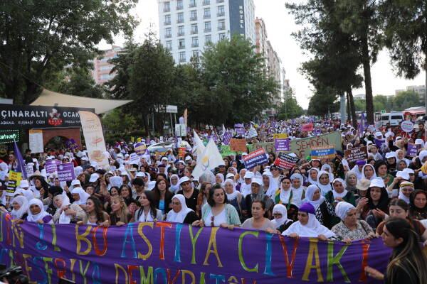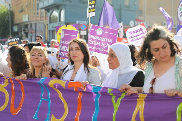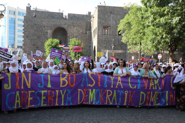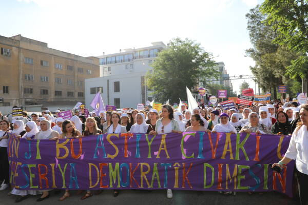 Li Amedê bi hezaran jin bi dirûşmeya “Jin ji bo aştiya civakî û çareseriya demokratîk dimeşin” meşiyan. Hevseroka Partiya Herêmên Demokratîk (DBP) Çîgdem Kiliçgun Uçar û Hevseroka Partiya Wekhevî û Demokrasiyê ya Gelan (DEM Partî) Tulay Hatîmogûllari jî beşdarî meşa ku di bin pêşengiya Tevgera Jinên Azad (TJA) de hat lidarxistin bûn.