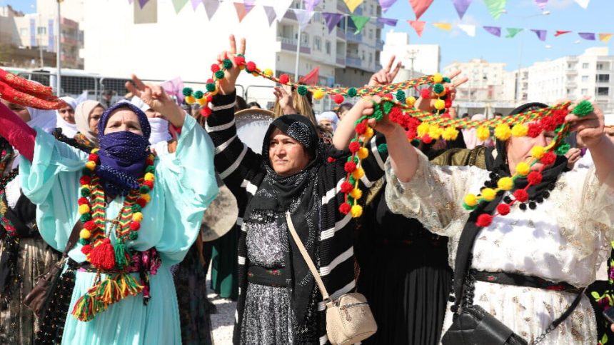 Mîtîng bi dirûşma “Em bi berxwedanê azad bikin, civaka demokratîk dihûnin”, li Bûlvara Newrozê hate lidarxistin û gelek jin beşdar bûn.