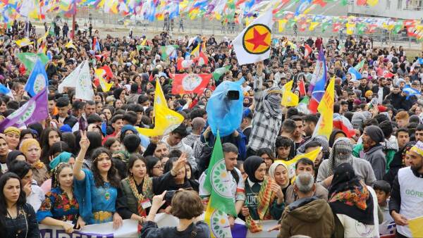 Bi hezaran kes serê sibehê li hev kom bûn û bi flamayên kesk, sor û zer li gel dirûşmên “Bijî Newroz” û “Bijî Serok Apo” heta qadê meşiyan.