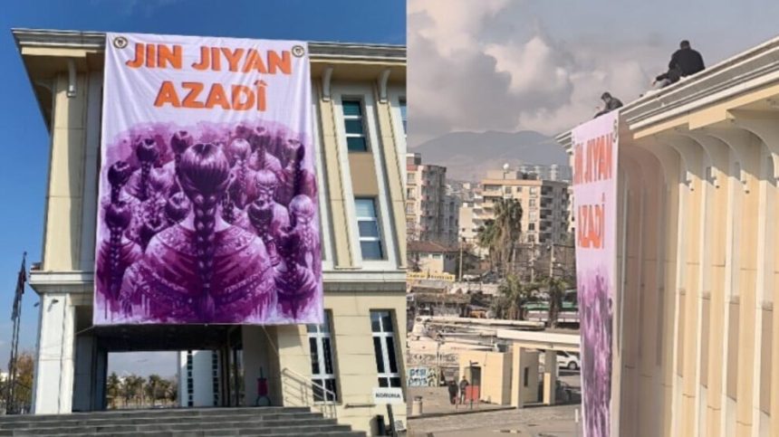 Pankarta bi nivîsa "Jin, Jiyan, Azadî" ya li avahiya xizmetê ya Şaredariya Cizîrê ya DEM Partiyê hatibû daliqandin, ji aliyê polîsan ve hate daxistin.