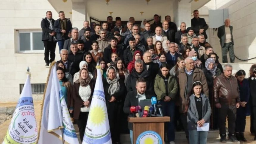 Endamê Rêveberiya Xweseriya Demokratîk a kantona Firatê, parêzer Mistefa Mislim li pêş navenda Meclisa Gelan a Demokratîk a bajêr bi amadebûna nûnerên ji meclisên Rêveberiya Xweser û endamên Meclisa Gelan daxuyanî xwend.