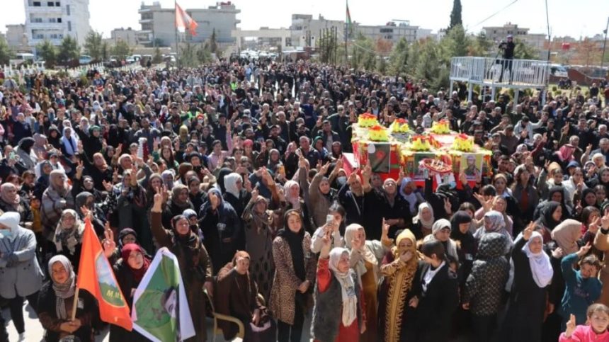 Bi hezaran kes ji şêniyên Qamişloyê li Şehîdgeha Şehîd Delîl Saroxan li hev kom bûn û ji bo şehîdan merasîmek lidar xistin. Di merasîmê de şervanên QSD’ê şehîd Mecîd Korêş (Tolhildan Efrîn), şehîd Egîd Xelîl (Devran Qamişlo) û şehîd Şêrmar Egîd Xelîl hatin veşartin. Ji bo şervana Yekîneyên Parastina Jin (YPJ) şehîd Şêrîn Îzeddîn (Hêzil Arjîn), şervanên Hêzên Sûriyeya Demokratîk (QSD) şehîd Xorşîd Mehmûd (Diyar Qamişlo), şehîd Rizgar Hesen (Şervan Qamişlo), şehîd Ehmed Xelîl (Ehmed), şehîd Egîd Xelîl (Devran Qamişlo) jî merasîma xiyabî hate lidarxistin.