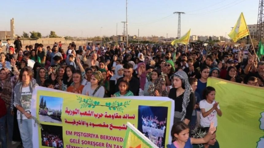 Koçberên Efrîn û Şehbayê yên li kantona Tepqayê bi dirûşmeya ‘’Em pişgiriyê didin berxwedana şerê gelê şoreşgerî li Şêxmeqsûd û Eşrefiyê’’ meşekî lidarxistin.