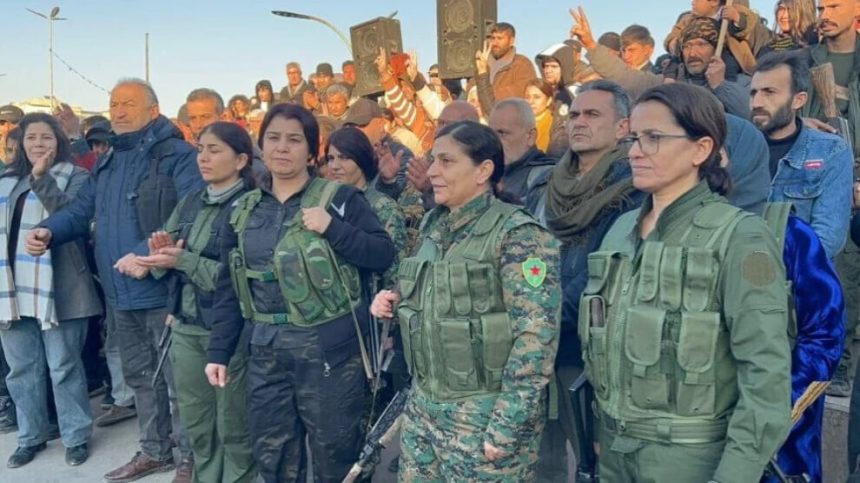 Yekîneyên Parastina Jinê (YPJ) û Hêzên Sûriyeya Demokratîk (QSD) li bajarê Kobanê li Qada Jin a Azad bi beşdariya gel daxuyaniyek dan.