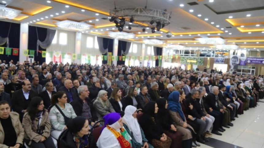 Di civînê de ku dirûşmeyên “Bijî Serok Apo” û “Şehîd namirin” hatin berzkirin, piştî axaftina kurt a Hevşaredara Êlihê Gulistan Sonuk a ku qeyûm tayinî şûna wê hat kirin, Mazlûm Dînç mafê axaftinê wergirt.
