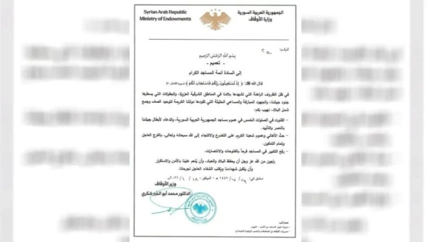 Wezareta Karûbarên Olî yê hikûmeta demkî yê Sûriyeyê (Ewqaf), bi daxuyaniyekê ji melayên mizgeftan xwest ku ji bo ‘serketina artêşê’ duayan bikin.