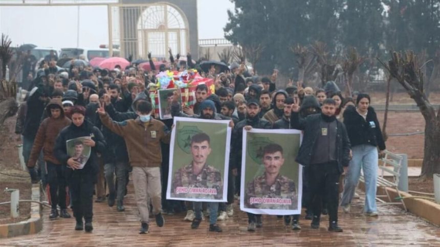 Meclisa Malbatên Şehîdan a bajarê Dirbêsiyê yê kantona Cizîrê merasîma cenaze ya şervanê QSD’ê Ciwan Rojava (Mesûd El Elo) ê ku 18’ê Çileyê di berxwedana li hemberî êrişên çeteyên hikumeta demkî de li Reqayê şehîd bûbû û ya endamê Hêzên Ewekariya Hundirîn şehîd Mihemed Kamil El Mamo ku 25’ê Çileyê li Qamişloyê di encama nexweşiyê de şehîd bûbû, li dar xist.